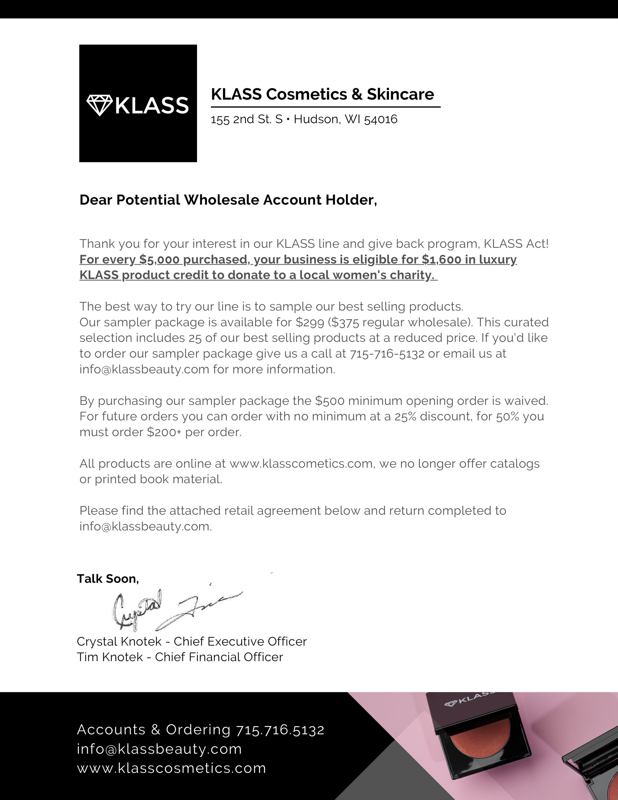 Thank you for your interest in our luxury product line and give back program, KLASS Act! Follow the link below to access our wholesale application.